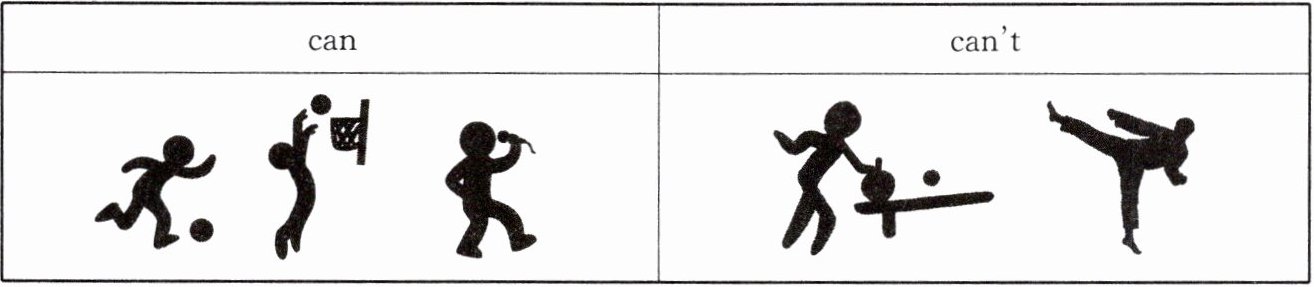 1. play football 2. I can play basketball 3. sing songs 4. play ping-pong 5. I can't do any kung fu