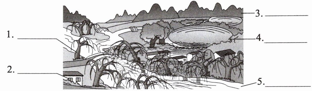 1. tree 2. house 3. mountain(s) 4. lake 5. river