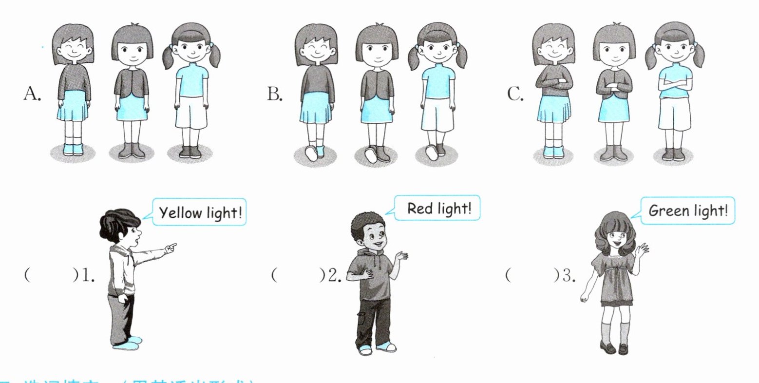 二、根据小朋友们的动作,给交通信号灯选择对应的图片。
