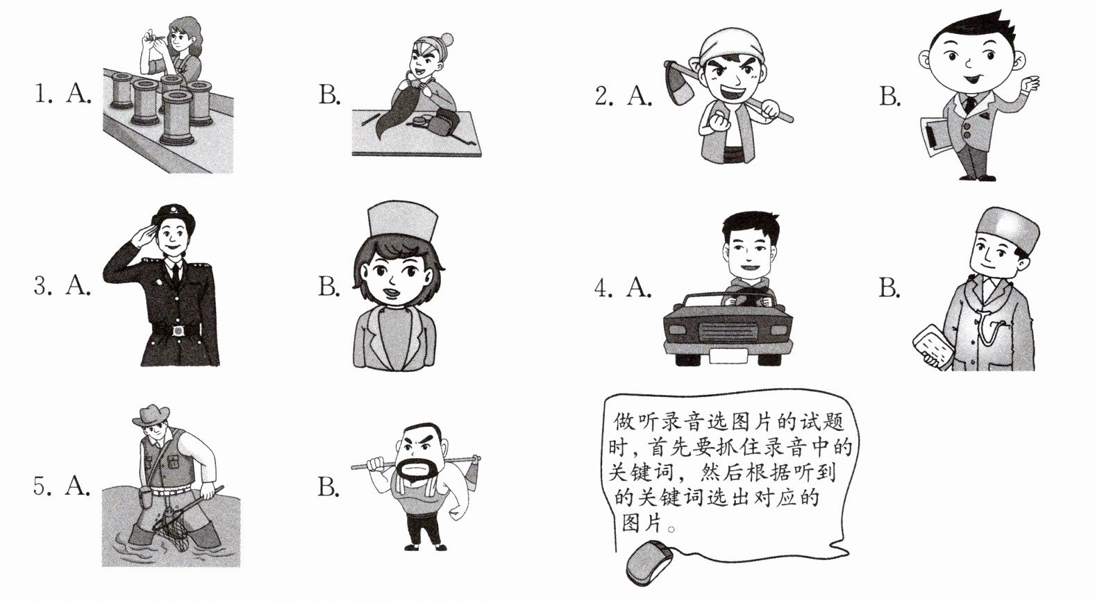 一、听录音,圈出与所听内容相符的图片。(10 分)