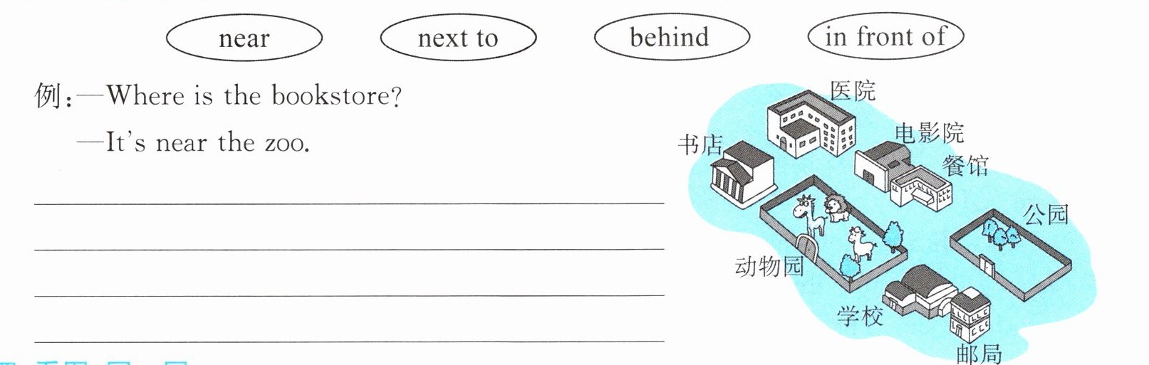三、根据图片,仿照例子,任选两个单词或词组写出两组对话。