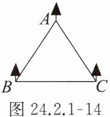 5. 如图 24.2.1 - 14,某公园有一个三角形花坛,三角形的顶点$A$,$B$,$C$上各有一棵古树。现决定把原来的花坛扩建成一个圆形花坛,要求三棵古树不能移动,且三棵古树位于圆周上,请你只用直尺和圆规在原图上画出你所设计的圆形花坛示意图,不写作法但保留作图痕迹。