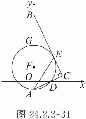 8. (江苏盐城中考)如图24.2.2 - 31,在平面直角坐标系中,Rt△ABC的斜边AB在y轴上,边AC与x轴交于点D,AE平分∠BAC交边BC于点E,经过点A,D,E的圆的圆心F恰好在y轴上,⊙F与y轴相交于另一点G。