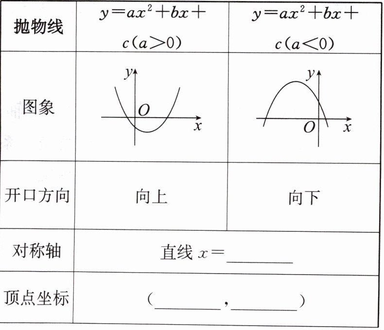 从左到右,从上到下依次填:$-\frac{b}{2a}$;$(-\frac{b}{2a},\frac{4ac - b^{2}}{4a})$;$-\frac{b}{2a}$;$(-\frac{b}{2a},\frac{4ac - b^{2}}{4a})$;$-\frac{b}{2a}$;$-\frac{b}{2a}$;$\frac{4ac - b^{2}}{4a}$;$\frac{4ac - b^{2}}{4a}$。