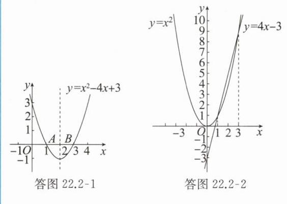 解:如答图22.2-1,画出函数$y=x^{2}-4x+3$的图象,由图象可得,它与x轴的交点A,B的横坐标分别是1,3,所以$x^{2}-4x+3=0$的解是$x_{1}=1$,$x_{2}=3$.