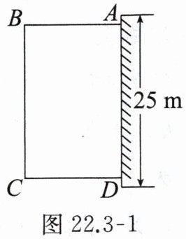 【例1】为了改善小区环境,某小区决定要在一块一边靠墙(墙长 $ 25 $ m)的空地上修建一个矩形绿化带 $ ABCD $,绿化带一边靠墙,另三边用总长为 $ 40 $ m 的栅栏围住(如图22.3 - 1)。设绿化带的 $ BC $ 边长为 $ x $ m,绿化带的面积为 $ y $ $ m^2 $。