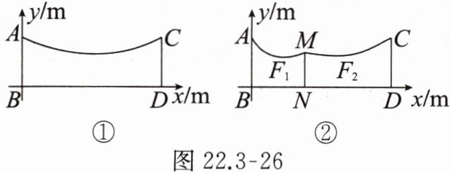 (2) 因实际需要,在离 $ AB $ 为 3 m 的位置处用一根立柱 $ MN $ 撑起绳子(如图22.3 - 26②),使左边抛物线 $ F_1 $ 的最低点距 $ MN $ 为 1 m,离地面 1.8 m,求 $ MN $ 的长。