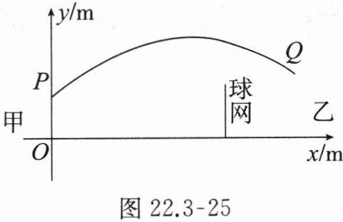 8. (浙江金华中考)甲、乙两人进行羽毛球比赛,羽毛球飞行的路线为抛物线的一部分,如图22.3 - 25,甲在 $ O $ 点正上方 1 m 的点 $ P $ 处发出一球,羽毛球飞行的高度 $ y $(单位:m)与水平距离 $ x $(单位:m)之间满足函数解析式 $ y = a(x - 4)^2 + h $。已知点 $ O $ 与球网的水平距离为 5 m,球网的高度为 1.55 m。
