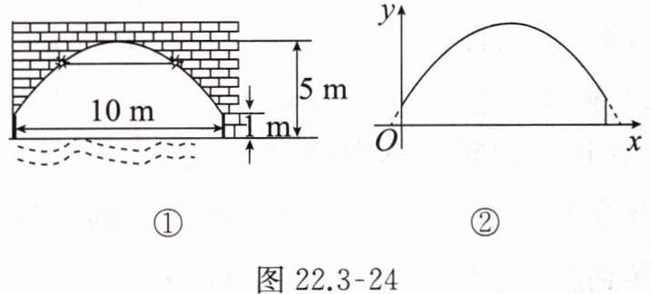 7. 一座拱桥的截面图如图22.3 - 24①所示,拱桥桥洞上沿是抛物线形状,抛物线两端点与水面的距离都是 1 m,拱桥的跨度为 10 m,桥洞与水面的最大距离是 5 m,桥洞两侧壁上各有一盏距离水面 4 m 的景观灯。在平面直角坐标系中,拱桥的截面图如图22.3 - 24②所示。