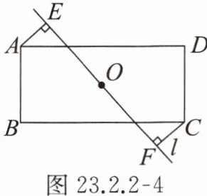 2. 如图 23.2.2 - 4 所示,直线$l$经过矩形$ABCD$的对称中心$O$,分别过点$A$和点$C$作直线$l$的垂线,垂足分别为点$E$和点$F$。求证:$OE = OF$。