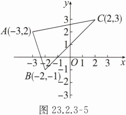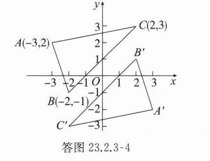 4.点A(-3,2),B(-2,-1),C(2,3)关于原点的对称点分别为A'(3,-2),B'(2,1),C'(-2,-3).依次连接A'B',B'C',C'A',便可得到所求作的△A'B'C',如答图23.2.3−4所示.