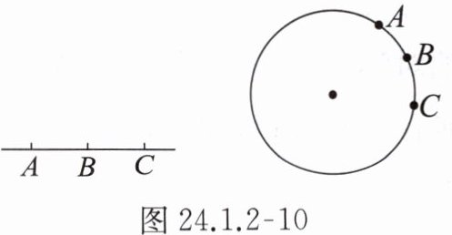 思考2:如图24.1.2-10,同一条直线上的两线段AB,BC有数量关系$AB + BC = AC$,那么同一圆弧上的两段弧$\overset{\frown}{AB}$,$\overset{\frown}{BC}$与$\overset{\frown}{AC}$有什么关系?