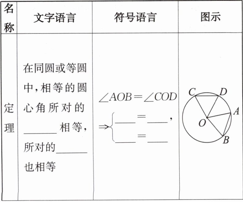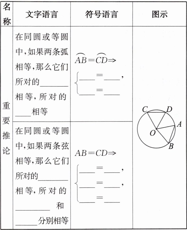 定理处依次填弧、弦;符号语言处依次填弧AB、弧CD、AB、CD。重要推论第一部分依次填圆心角、弦;符号语言处依次填∠AOB、∠COD、AB、CD。重要推论第二部分依次填圆心角、优弧、劣弧;符号语言处依次填∠AOB、∠COD、弧AB、弧CD、弧ACB、弧CAD。