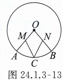 6. 如图24.1.3-13,已知OA,OB是⊙O的半径,C为$\overset{\frown}{AB}$的中点,M,N分别是OA,OB的中点,求证:MC = NC.