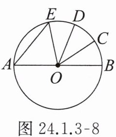 1. 如图24.1.3-8,AB是⊙O的直径,$\overset{\frown}{BC} = \overset{\frown}{CD} = \overset{\frown}{DE}$,∠COD = 34°,则∠AEO的度数是(