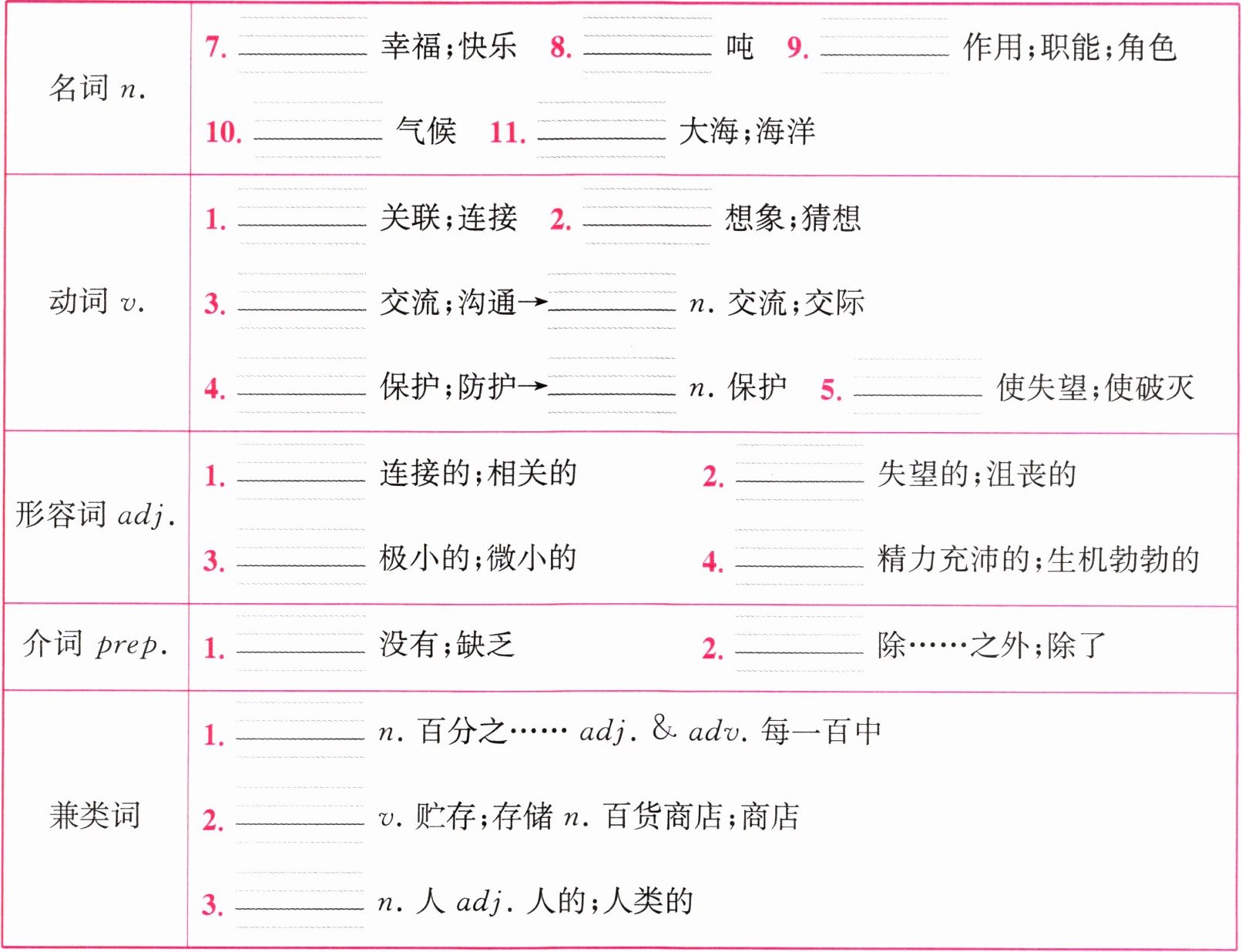 名词 n. 1. honey 2. connection 3. action; act 4. planet 5. importance; important 6. ant 7. happiness 8. ton 9. role 10. climate 11. ocean 动词 v. 1. connect 2. imagine 3. communicate; communication 4. protect; protection 5. disappoint 形容词 adj. 1. connected 2. disappointed 3. tiny 4. lively 介词 prep. 1. without 2. except 兼类词 1. per cent 2. store 3. human