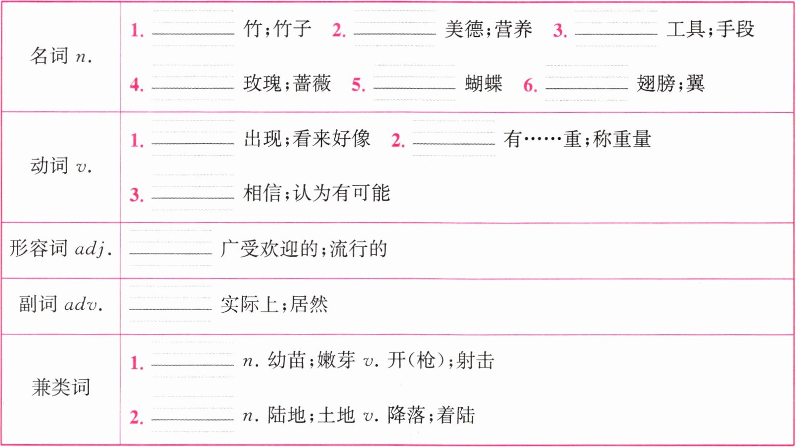 |名词 $ n. $|1. ______ 竹;竹子 2. ______ 美德;营养 3. ______ 工具;手段4. ______ 玫瑰;蔷薇 5. ______ 蝴蝶 6. ______ 翅膀;翼|