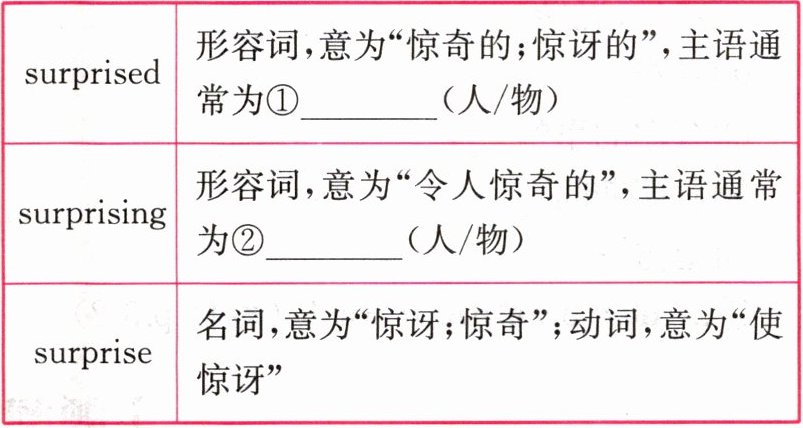|surprising|形容词,意为“令人惊奇的”,主语通常为②______(人/物)|