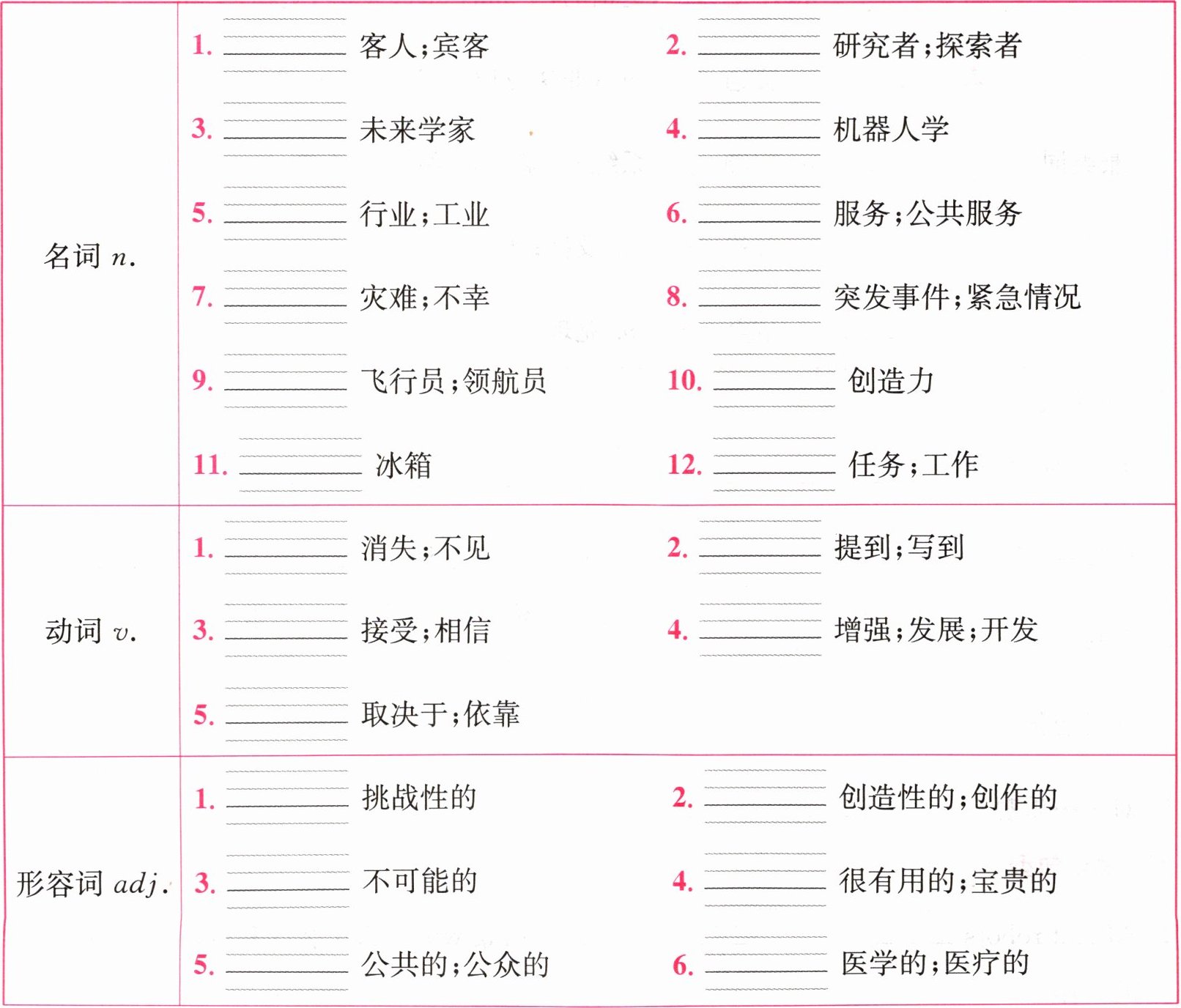 | 名词 $ n. $ | 1. ____ 客人;宾客 2. ____ 研究者;探索者 3. ____ 未来学家 4. ____ 机器人学 5. ____ 行业;工业 6. ____ 服务;公共服务 7. ____ 灾难;不幸 8. ____ 突发事件;紧急情况 9. ____ 飞行员;领航员 10. ____ 创造力 11. ____ 冰箱 12. ____ 任务;工作 |