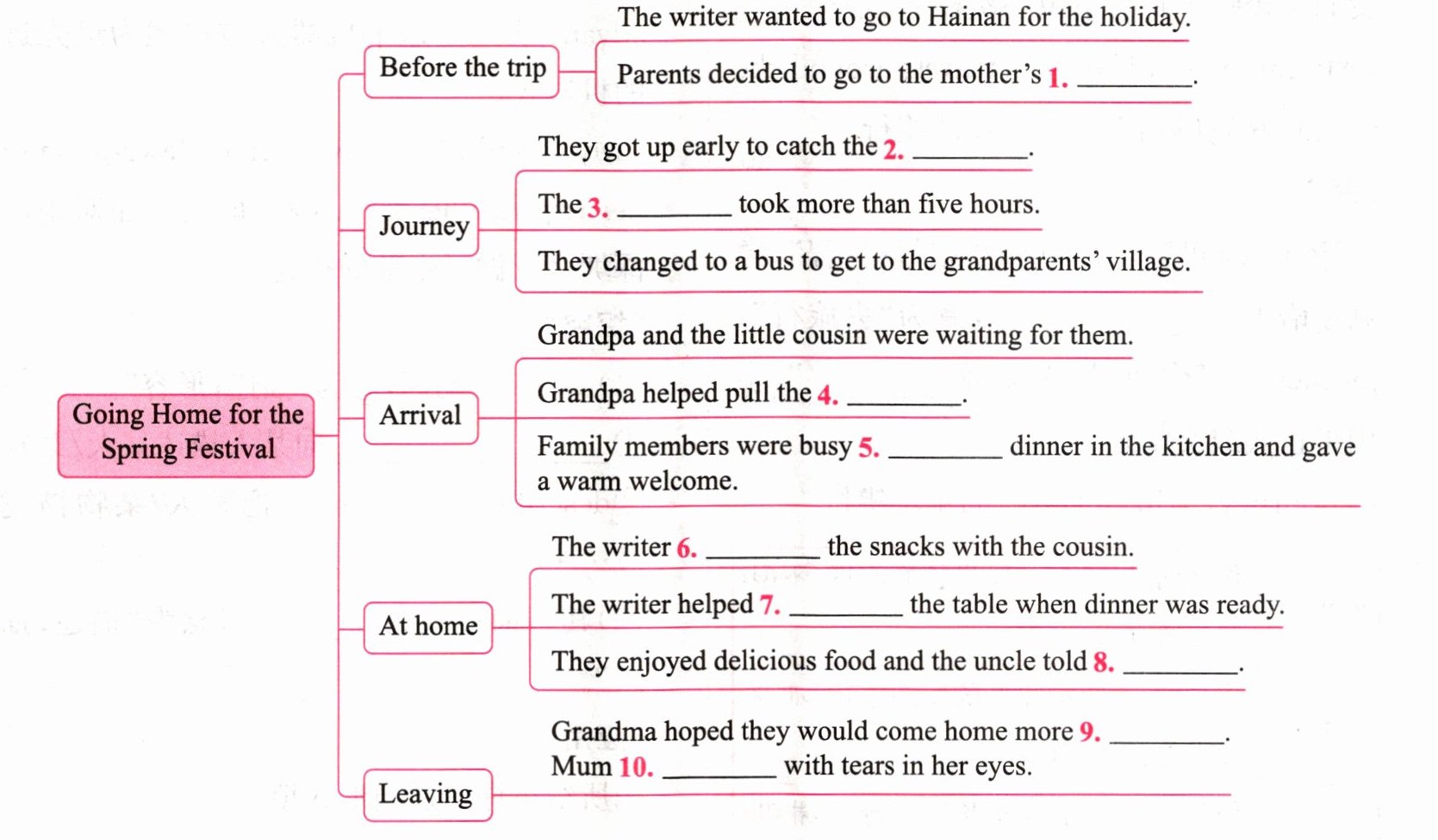 Work in groups to role-play the characters from the text (e.g. Dad, Mum, Grandpa, Grandma) and act out the scene of the family's return home for the Spring Festival.