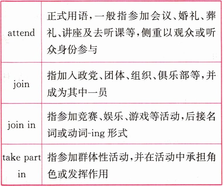 | attend | 正式用语,一般指参加会议、婚礼、葬礼、讲座及去听课等,侧重以观众或听众身份参与 |