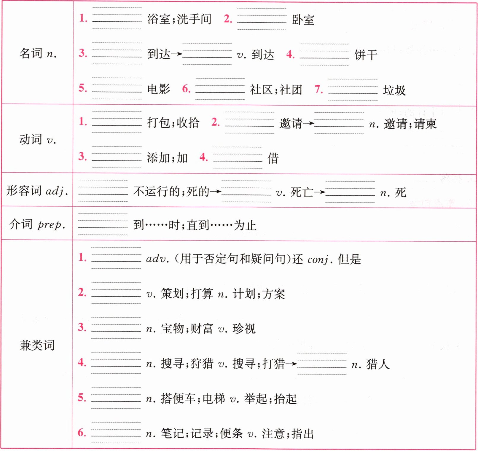 | 动词 $ v. $ | 1. 打包;收拾 2. 邀请→ $ n. $ 邀请;请柬