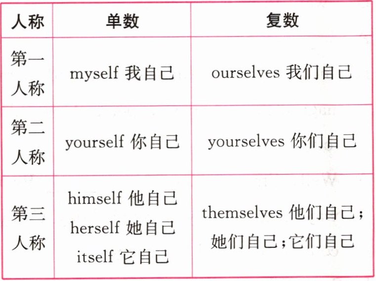 |第三人称|himself 他自己 herself 她自己 itself 它自己|themselves 他们自己;她们自己;它们自己|