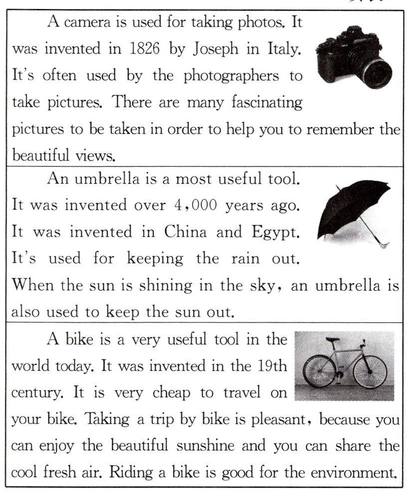 |自行车|当今世界很有用的工具,发明于19世纪,骑车旅行便宜,能享受阳光和新鲜空气,对环境有益。||