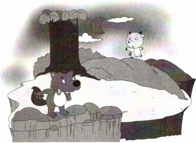 One beautiful spring evening, a hungry wolf went out to look for his supper. He saw a little goat. The goat stood on a steep cliff.