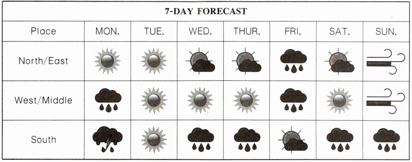 5. 题目中提到Jessica住在北部,她可以在下周五去野餐。但根据7天天气预报,北部下周五是雨天,不适合野餐。所以这个句子与天气预报不相符。