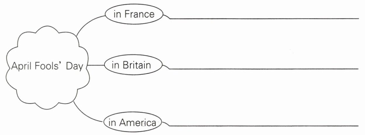这是一道英语阅读理解题,考查对短文内容的理解和提取关键信息的能力。解题的关键在于仔细阅读短文,找到每个国家庆祝愚人节的不同方式,然后准确填写在思维导图对应的位置。