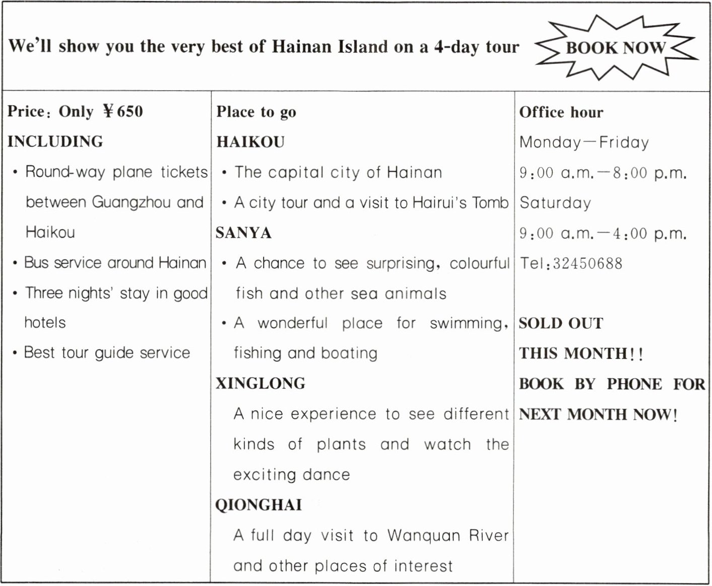 | Price:Only ¥ 650INCLUDING• Round-way plane tickets between Guangzhou and Haikou• Bus service around Hainan• Three nights' stay in good hotels• Best tour guide service | Place to goHAIKOU• The capital city of Hainan• A city tour and a visit to Hairui's TombSANYA• A chance to see surprising,colourful fish and other sea animals• A wonderful place for swimming,fishing and boatingXINGLONGA nice experience to see different kinds of plants and watch the exciting danceQIONGHAIA full day visit to Wanquan River and other places of interest | Office hourMonday—Friday9:00 a.m.—8:00 p.m.Saturday9:00 a.m.—4:00 p.m.Tel:32450688SOLD OUTTHIS MONTH!!BOOK BY PHONE FORNEXT MONTH NOW! |