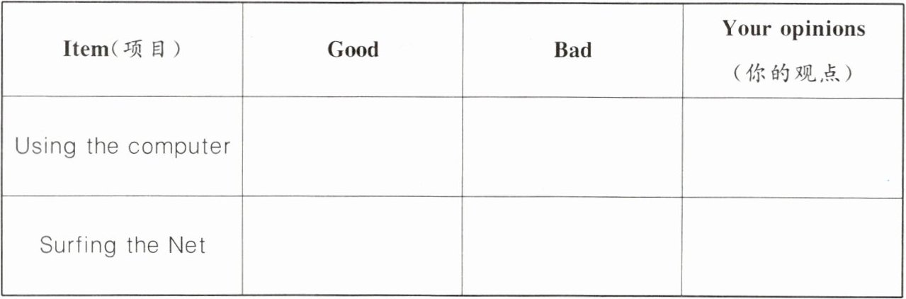 根据两篇小短文,完成下面的表格,收集使用电脑和上网的利弊,如果你还有其他观点,补充在表格内。