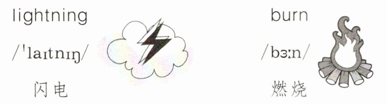 lightning /'laɪtnɪŋ/ 闪电 burn /bɜ:n/ 燃烧 hit /hɪt/ (用手或器具)击,打 stone /stəʊn/ 石头 spark /spɑ:k/ 火花 go out (火)熄灭(过去式 went out) rub /rʌb/ 擦;磨 heat /hi:t/ 热 match /mætʃ/ 火柴 electric /ɪ'lektrɪk/ 电的