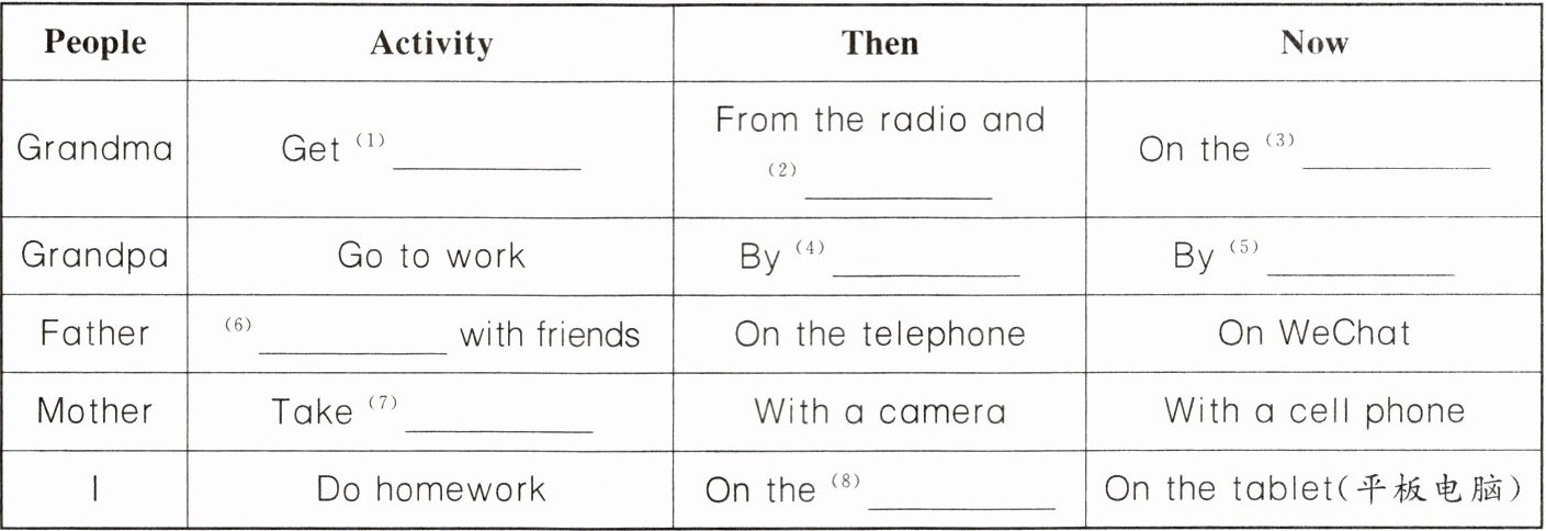 这是一道英语听力填空题,考查对短文内容的理解和信息提取能力。解题关键在于认真听录音,捕捉与表格中人物活动相关的过去和现在的方式等信息。