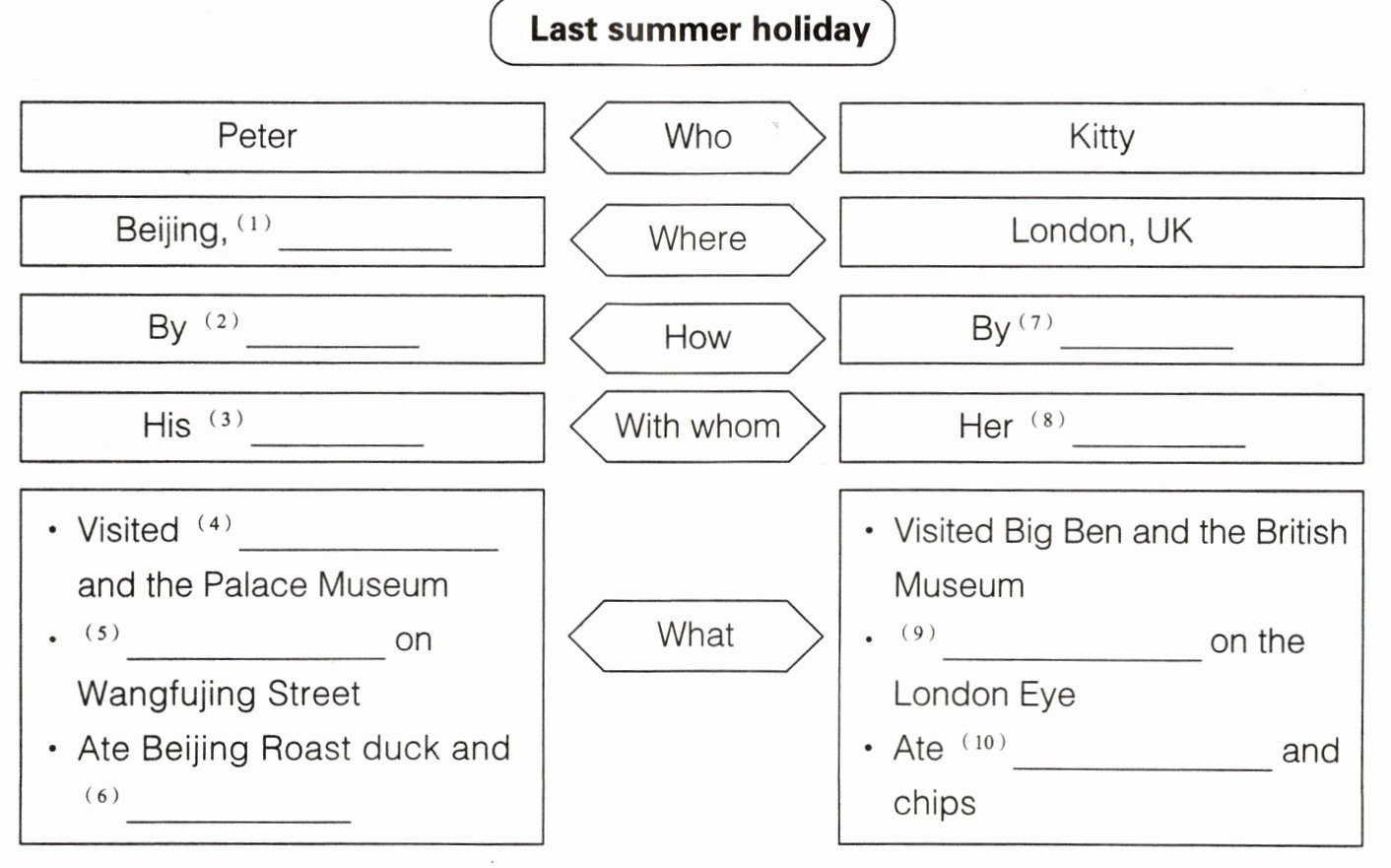 | · Visited (4)______ and the Palace Museum· (5)______ on Wangfujing Street· Ate Beijing Roast duck and (6)______ | What | · Visited Big Ben and the British Museum· (9)______ on the London Eye· Ate (10)______ and chips |