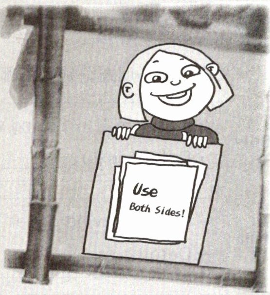 Let's try to save paper together! First, use both sides of your paper. Don't throw paper in the garbage can after using only one side. Next, use less paper. You can email someone instead of writing a letter. Last, try to buy used books or borrow books from the library. You can also read e-books. It's easy to use less paper!