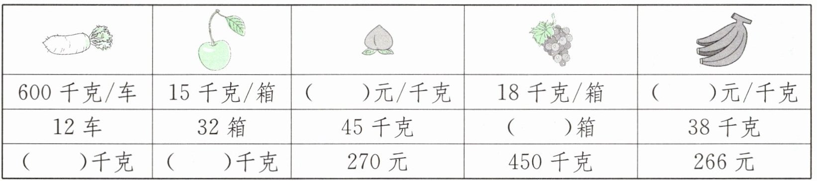 | 600 千克/车 | 15 千克/箱 | ( )元/千克 | 18 千克/箱 | ( )元/千克 |