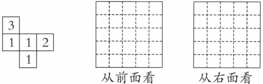 5. 左下图是从上面看一些小正方体所搭几何体的平面图,方格中的数字表示该位置的小正方体的个数。请你在方格纸中分别画出这个几何体从前面和右面看到的图形。