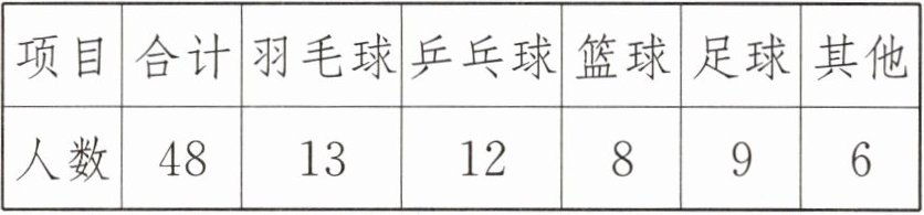 |项目|合计|羽毛球|乒乓球|篮球|足球|其他|