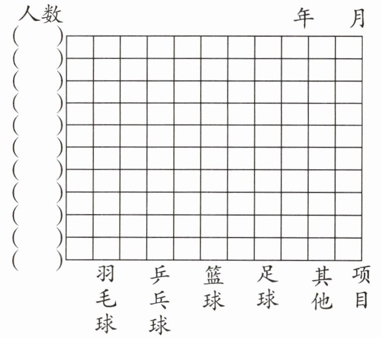 3. 新情境 杭州亚运会 杭州第19届亚运会在我国杭州举办,亚运会中球类运动所占比例较大,激发了同学们进行球类运动的热情。四(2)班同学最喜欢的球类项目如下表,请根据表中数据完成条形统计图。