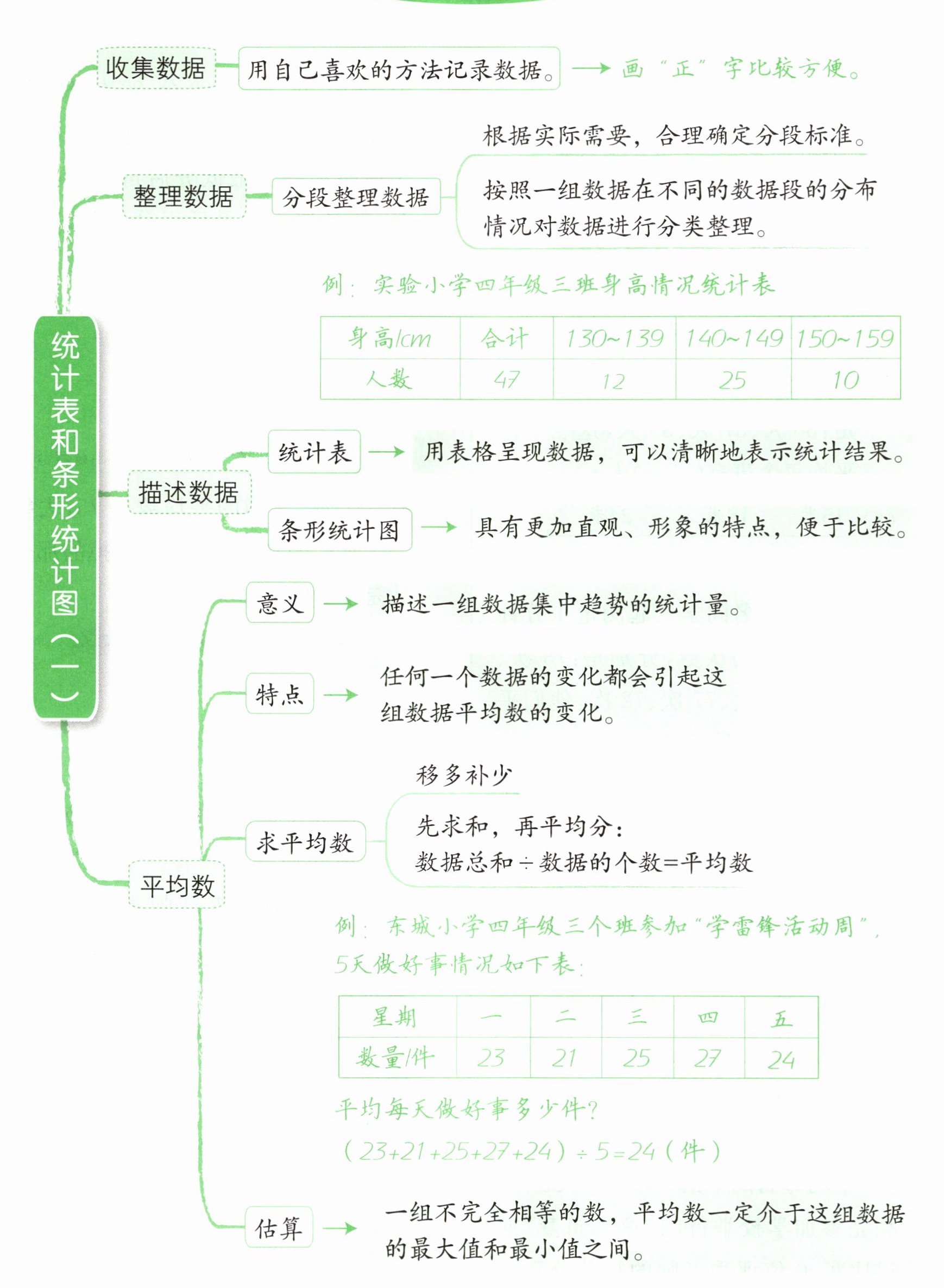求平均数:可以通过移多补少的方法,或者先求和,再平均分(数据总和÷数据的个数 = 平均数)。