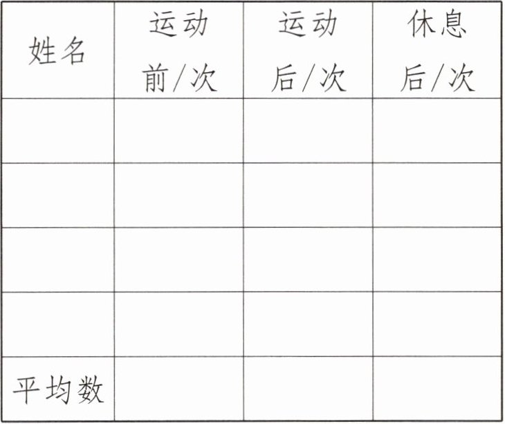 | 姓名 | 运动前/次 | 运动后/次 | 休息后/次 |