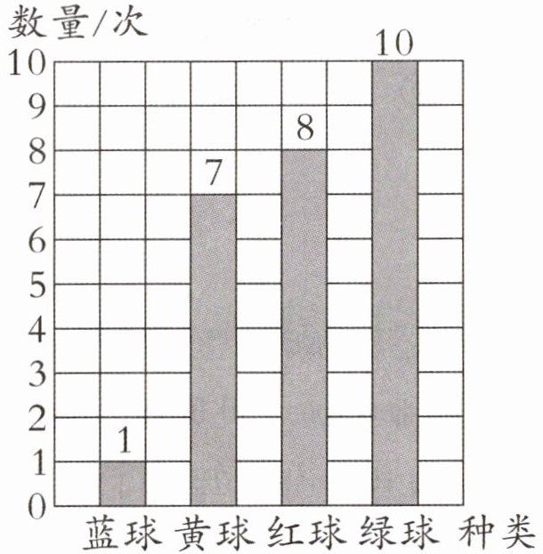 1. 明明在玩摸球游戏,下面的条形统计图记录的是明明摸出各种颜色的球的次数。