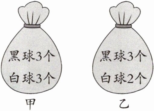 3. 在下面的口袋里任意摸一个球,在( )口袋里摸到白球和黑球的可能性是相等的,在( )口袋里摸到白球和黑球的可能性是不相等的。在乙口袋里摸球,摸到( )球的可能性大一些。