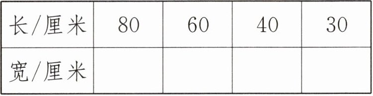 2. 一个面积为480平方厘米的长方形,如果长是80厘米,那么它的宽是多少厘米?如果长是60厘米、40厘米、30厘米,那么宽分别是多少厘米呢?请把结果填在下表中。