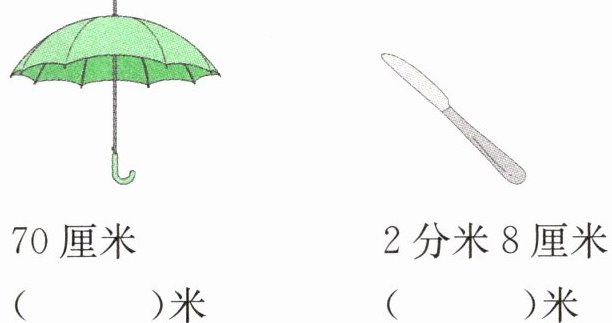 7. 把下面物体的长度改写成用“米”作单位的两位小数。 70厘米 ( )米 2分米8厘米 ( )米 2米2分米 ( )米 25米 ( )米