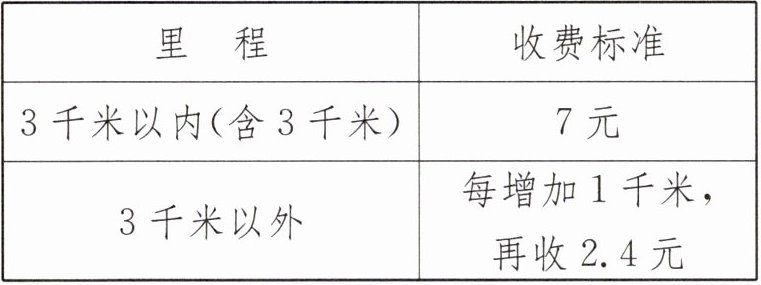 [提示]先求出3千米以外的费用,再求出3千米以外的路程,最后求出一共的路程。