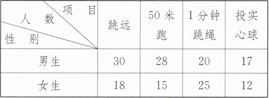| | 跳远 | 50米跑 | 1分钟跳绳 | 投实心球 |