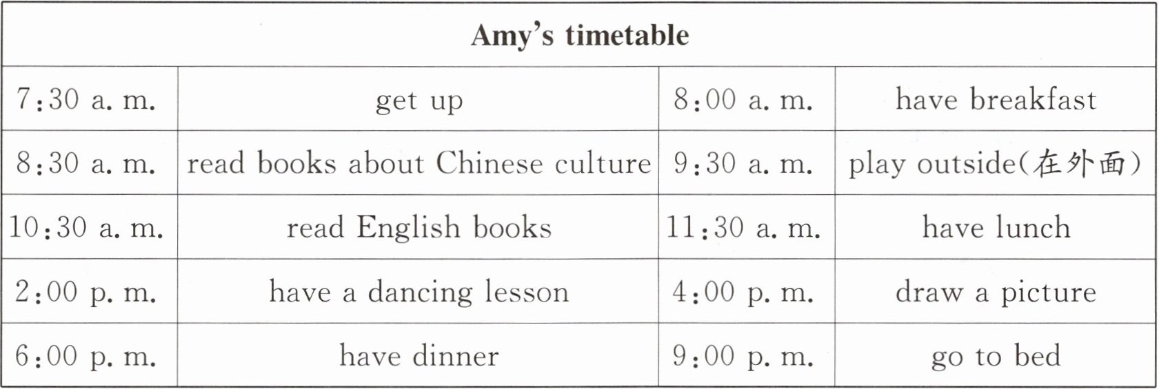 | 8:30 a.m. | read books about Chinese culture | 9:30 a.m. | play outside(在外面) |